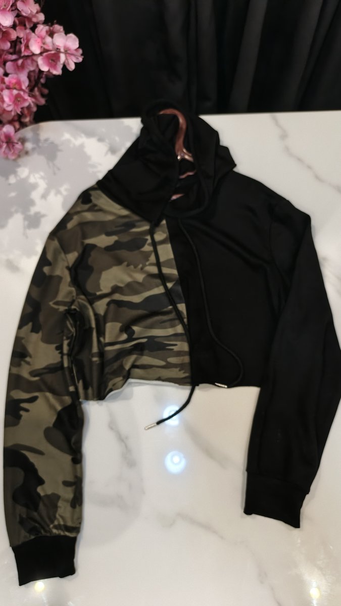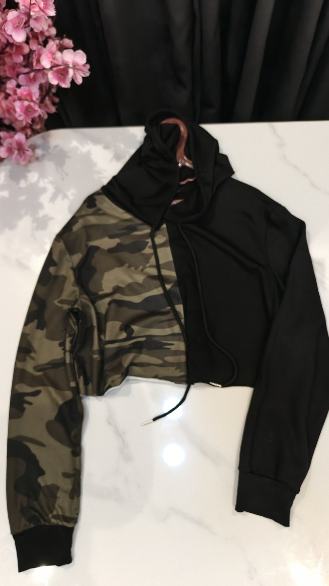 A trendy cropped hoodie with a bold split design; one side camo, the other black. It features long sleeves, ribbed cuffs, and a drawstring hood. Made from a soft cotton-blend fabric, it’s lightweight, comfortable, and perfect for a casual, edgy look.